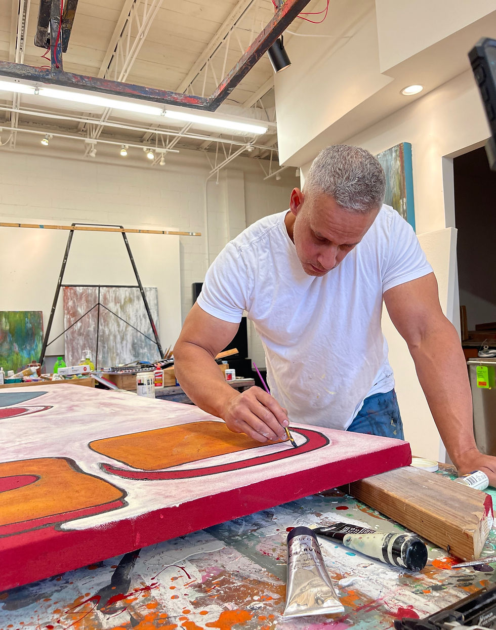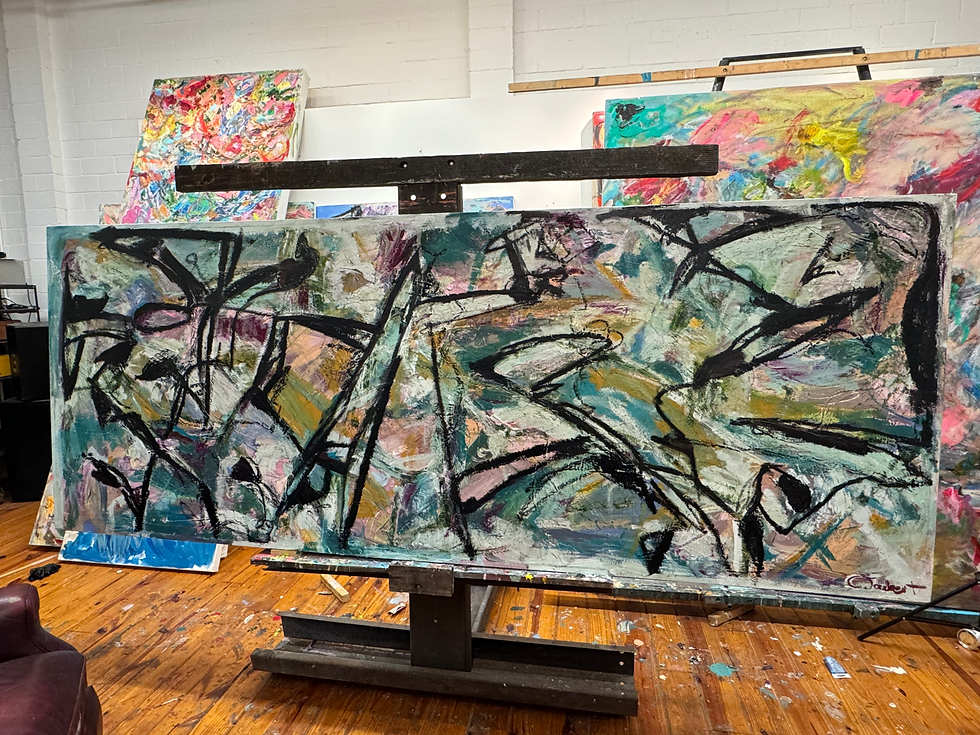 I generally use mixed media on raw canvas or drop cloths on 4 inch thick stretcher that I build. Heavily textured and multi-layered oil, acrylic, oil stick, wax, crayon and chalk is applied by either home made knifes or brush.