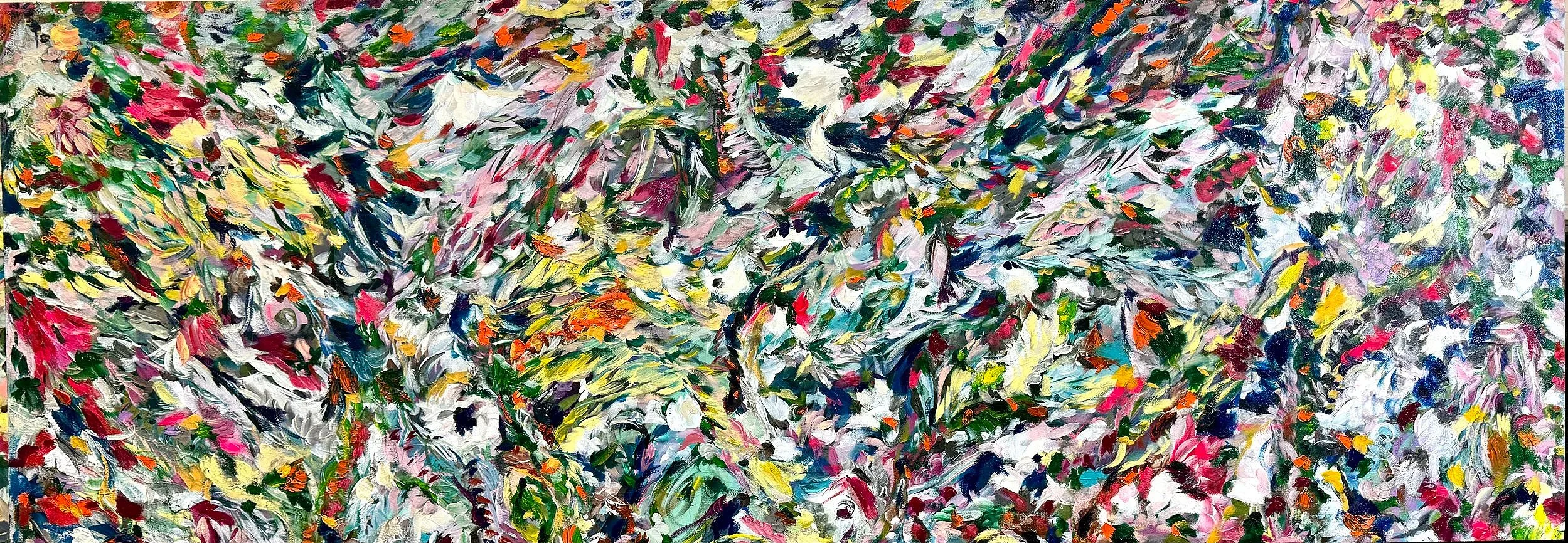 Long horizontal works allow the composition to unfold across space, emphasizing movement, balance, and subtle variation. Rather than centering on a single focal point, the painting develops through rhythm and layering, creating a calm, expansive presence that integrates naturally into an interior.