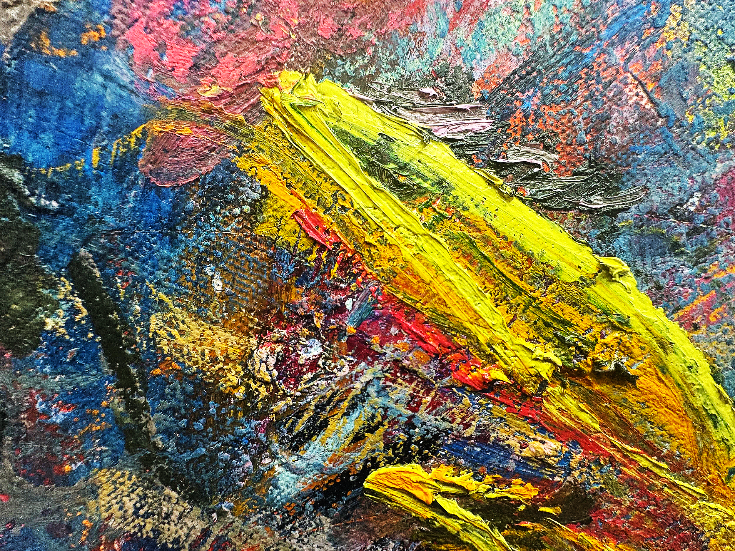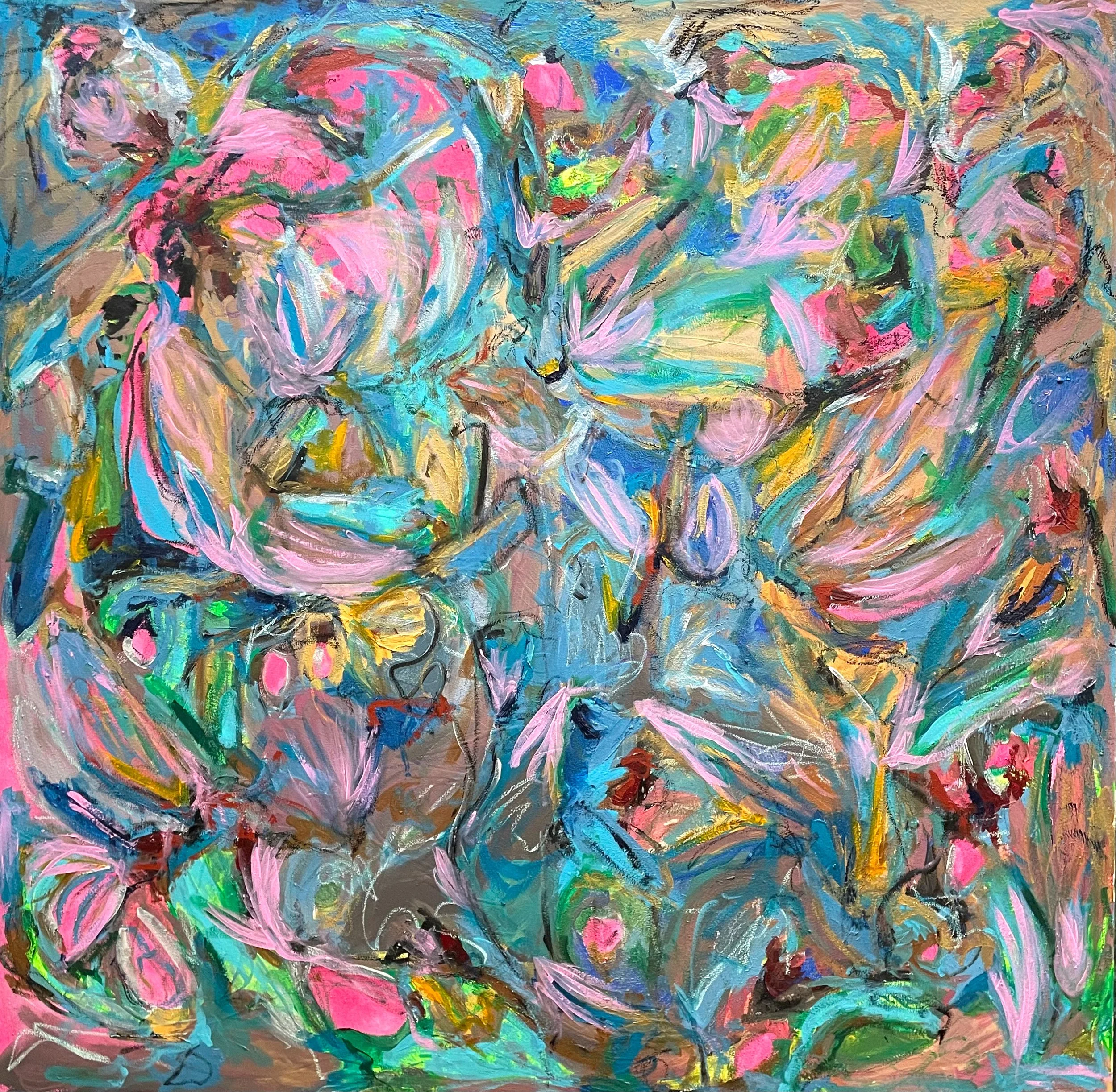 The color palette shifts the energy of the work. The soft pink ground holds the composition in place, while more saturated blues, yellows, and neutrals move across it, creating rhythm and contrast. The brighter tones act almost like signals within the piece—moments that guide the eye and activate the surface.