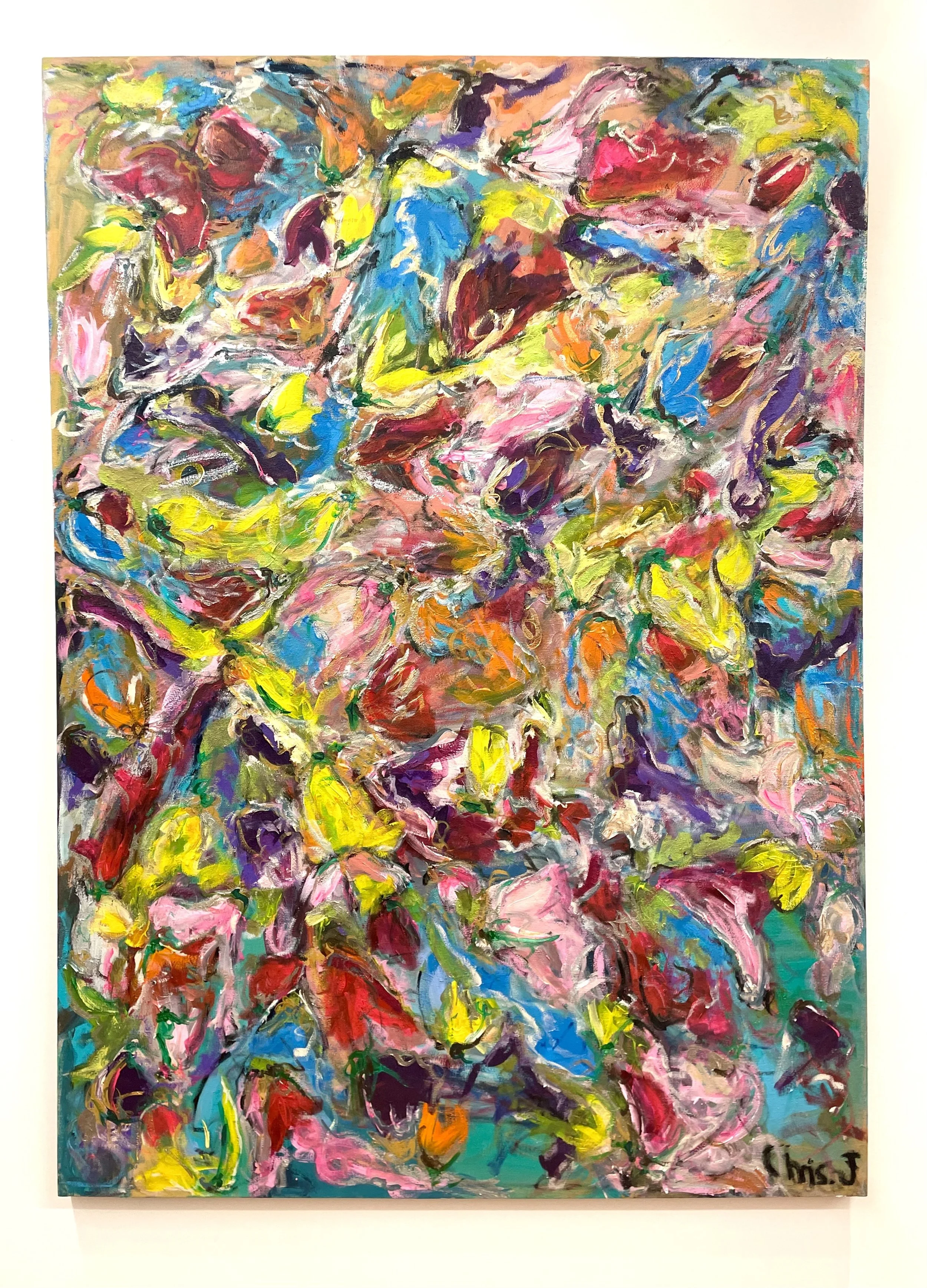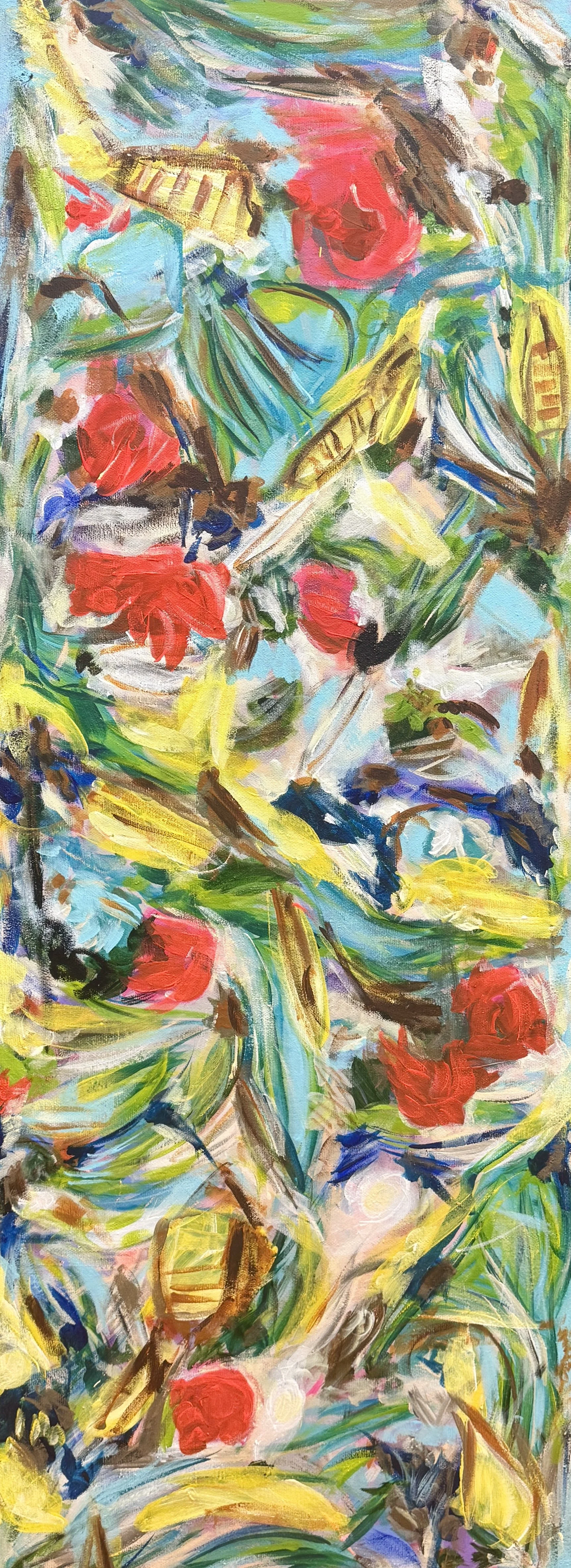 18"w x 56"l Acrylic on drop cloth.Vertical compositions emphasize elevation and movement, guiding the eye upward while allowing the surface to unfold gradually. The format creates a quiet tension between structure and openness, making each piece feel both grounded and expansive within a space.